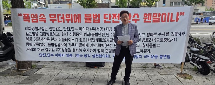 | ▲공익실천협의회 대표 김화경 목사는 25년 여름 단전·단수 당한 주민을 위해 기자회견을 해서 하루만에 해결했다. |