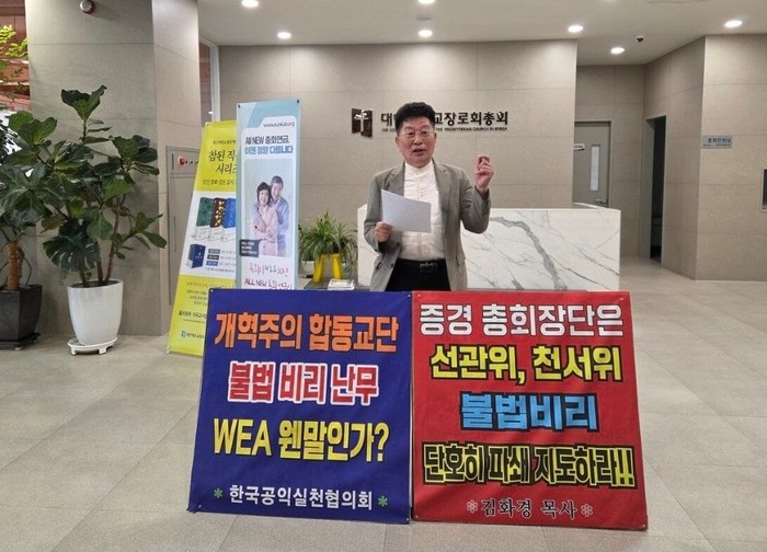 | ▲공익실천협의회 대표 김화경 목사는 한국교계 부조리에 대해 1인 시위하고 있다.(본인제공) |