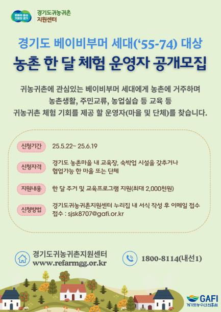 [코리아 이슈저널=홍춘표 기자] 경기도귀농귀촌지원센터가 오는 6월 19일까지 ‘경기도 베이비부머 농촌 한 달 체험’을 운영할 마을·단체를 모집한다.