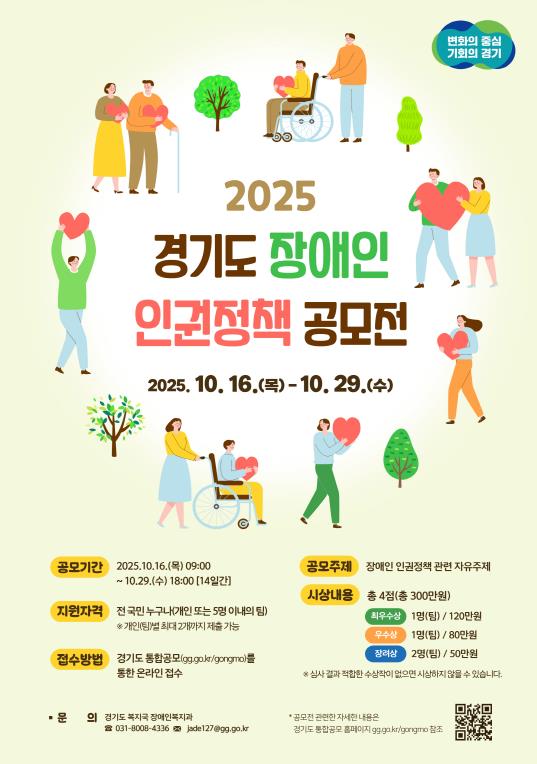 [코리아 이슈저널=홍춘표 기자] 경기도가 장애인의 정책 참여 확대, 실효성 있는 제도 개선, 생활 속 인권 향상과 인식 개선을 위한 정책 아이디어 발굴을 위해 10월 16일부터 29일까지 ‘2025년 경기도 장애인 인권정책 공모전’을 개최한다.
