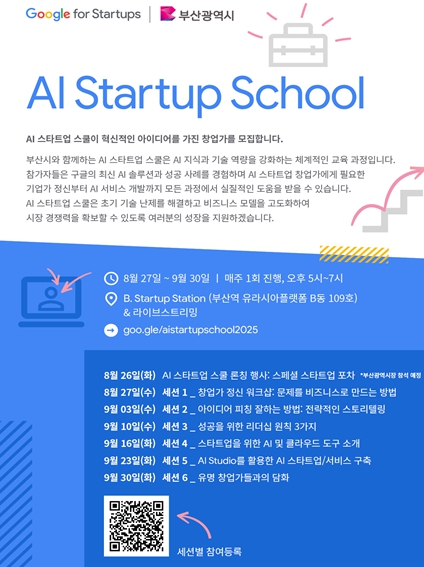 남동우 시 금융창업정책관은 “부산시와 구글(Google for Startups)의 협력으로 진행하는 '인공지능(AI) 스타트업 스쿨'이 올해는 인공지능(AI) 콘텐츠를 강화해 국내 유일, 부산에서 선보이게 됐다”라며, “앞으로도 세계적(글로벌) 기업과의 지속적인 협력을 통해 부산의 창업생태계 성장을 이끌어 나가겠다”라고 전했다.