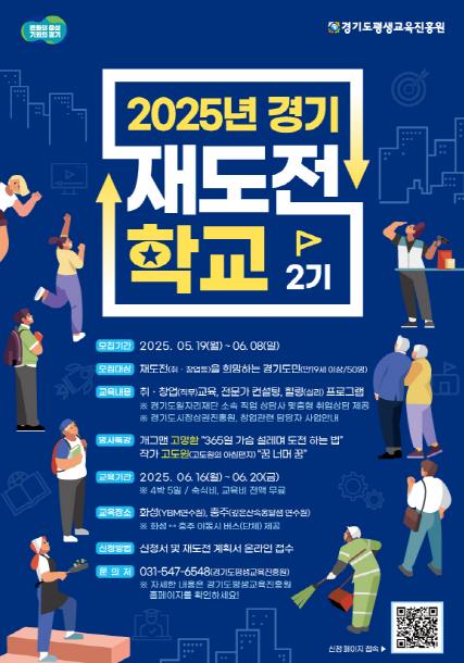 [코리아 이슈저널=홍춘표 기자] 경기도와 경기도평생교육진흥원은 취업이나 창업 실패를 경험한 도민의 재기를 지원하기 위해 오는 6월 8일까지 ‘2025년 경기 재도전학교’ 제2기 참가자를 모집한다.