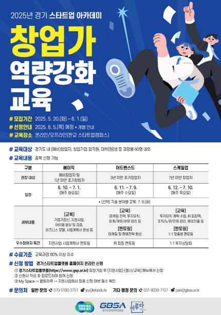 [코리아 이슈저널=홍춘표 기자] 경기도와 경기도경제과학진흥원은 5월 20일부터 6월 1일까지 ‘경기 스타트업 아카데미’ 상반기 창업가 역량강화 교육 참여자 180명을 모집한다.