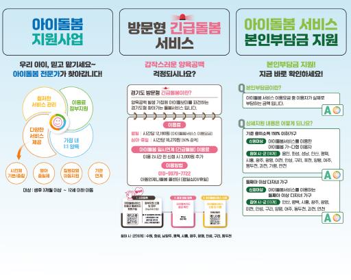 경기도에서 시행하는 ‘아이돌봄 서비스’는 생후 3개월 이상부터 12세까지의 아동을 대상으로 가정으로 직접 찾아가 돌봐주는 보육서비스다. ▲야간, 주말 등 긴급상황 발생시 ‘방문형 긴급돌봄 서비스’ ▲꼭 필요한 시간만큼만 돌봐주는 ‘시간제 돌봄’ ▲생후 12개월 이하 어린아이를 종일 돌봐주는 ‘영아종일제 돌봄’ ▲부모의 경제적 부담을 덜어주는 ‘아이돌봄서비스 본인부담금 지원’ 등이 있다.