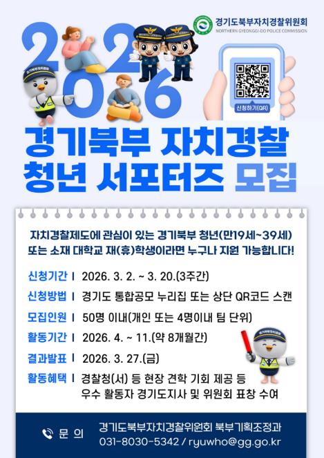 [코리아 이슈저널=홍춘표 기자] 경기도북부자치경찰위원회는 자치경찰제에 대한 청년층의 관심을 높이고 현장 중심 치안 활동을 함께할 ‘2026 경기북부 자치경찰 청년 서포터즈’를 3월 2일부터 20일까지 공개 모집한다.