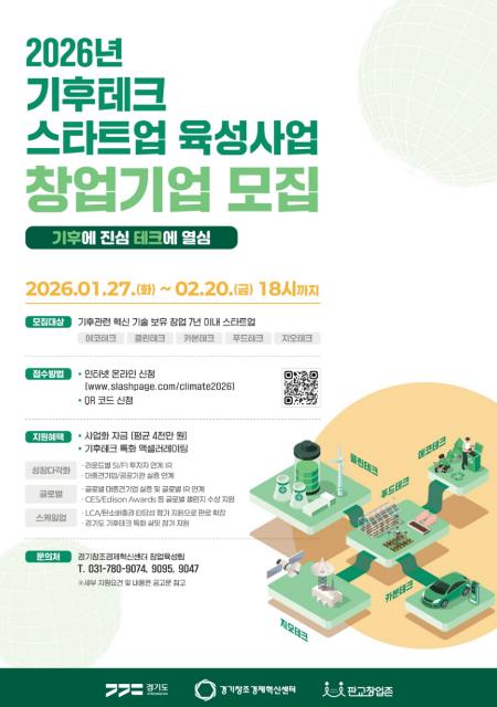 [코리아 이슈저널=홍춘표 기자] 경기도와 경기창조경제혁신센터가 기후테크 스타트업을 글로벌 유니콘기업으로 육성하기 위해 2월 20일까지 ‘기후테크 스타트업 육성 3기’ 34개 사를 모집한다.