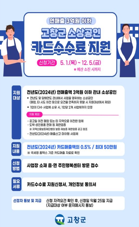 [코리아 이슈저널=김종오 기자] 고창군이 오는 5월1일부터 예산 소진시까지 ‘소상공인 카드수수료 지원사업’을 진행한다.