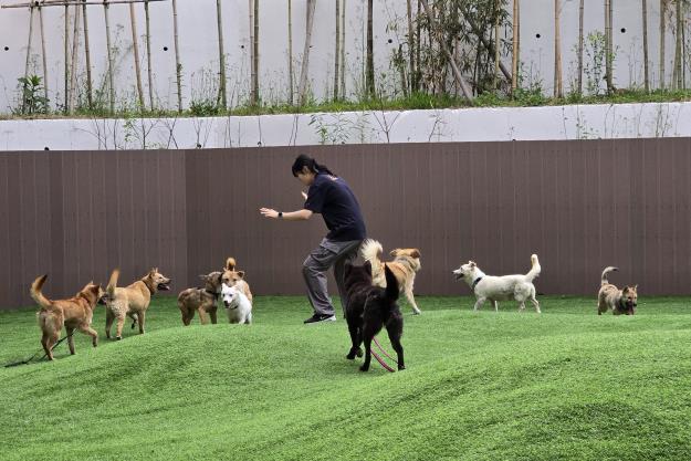 ▲ 경기도 반려마루 여주 직원이 경북 산불구조견들의 운동 및 사회화 활동을 하고 있다