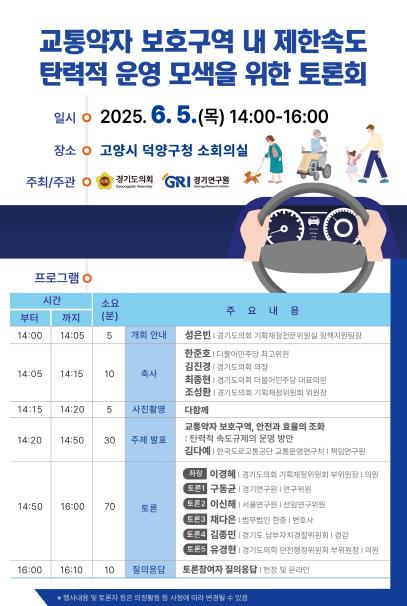 [코리아 이슈저널=홍춘표 기자] 경기연구원은 5일 고양시 덕양구청 소회의실에서 ‘교통약자 보호구역 내 제한속도 탄력적 운영 모색’을 주제로 토론회를 개최한다.