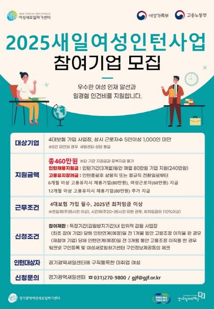 ‘새일여성인턴 사업’은 경력단절여성에게 일경험 기회를 제공하고, 고용 유지를 유도해 안정적인 취업을 지원하는 프로그램이다. 참여를 희망하는 기업과 인턴은 연중 상시 모집하며, 기업은 인건비 부담을 덜고 여성은 경력 회복의 기회를 얻을 수 있다.