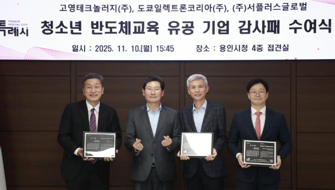 [코리아 이슈저널=홍춘표 기자] 용인특례시는 10일 시청 접견실에서 ㈜서플러스글로벌과 업무협약(MOU)을 체결하고, 지역 청소년 반도체 교육에 기여한 기업 3곳에 감사패를 수여했다고 11일 밝혔다.