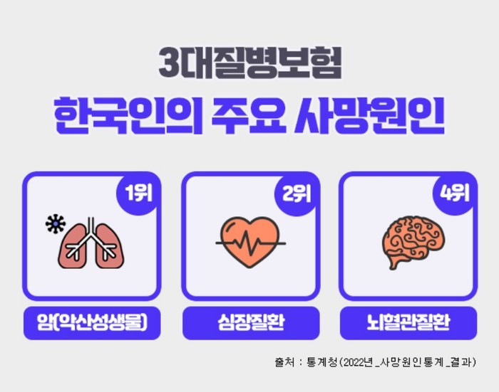 [코리아 이슈저널=최준석 기자] 흔히 3대질병이라 일컫는 암, 심혈관질환, 뇌혈관질환은 통계청 발표자료에 따르면 한국인의 주요 사망원인 중에서 3위 폐렴을 제외하고 1~4위를 차지하고 있으며, 이전부터 지금까지도 살면서 가장 먼저 대비해야 하는 치명적인 질병으로 강조되고 있다. 이러한 중대질병에 대비하기 위하여 상기 세가지 치명적인 질병을 집중보장하는 3대질병진단비보험을 많이 가입하고 있다. 3대진단비보험은 각각의 질병을 중점적으로 보장하면서도 가입자 특성에 맞는 특약을 추가함으로써 종합건강보험으로도 활용할 수가 있다.
