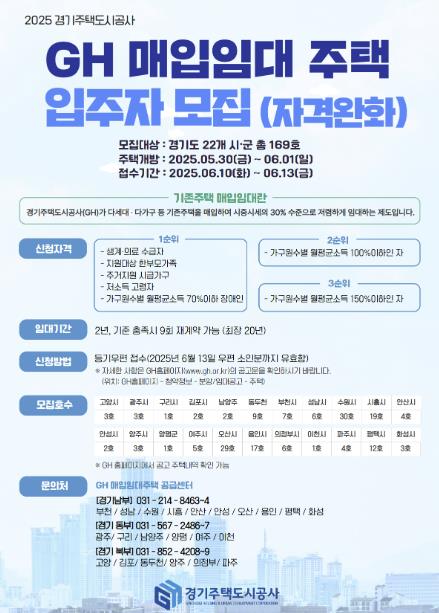 [코리아 이슈저널=홍춘표 기자] 경기주택도시공사(GH)는 경기도 내 취약계층의 주거안정을 위해 매입임대주택 입주자를 모집한다고 26일 밝혔다.