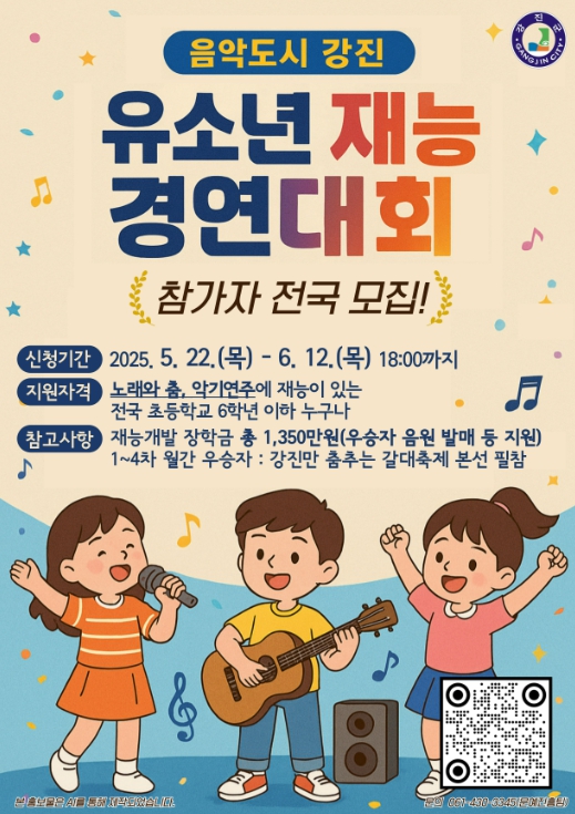 [코리아 이슈저널=김종오 기자] 강진군이 노래, 춤, 연주 분야에 재능을 가진 유소년을 발굴하고 미래 창의 인력 성장 지원의 기틀을 마련하기 위해 총 1,350만원의 재능개발 장학금이 수여되는 2025 음악도시 강진 유소년 재능 경연대회를 오는 6월 넷째 주 토요일부터 추진한다.