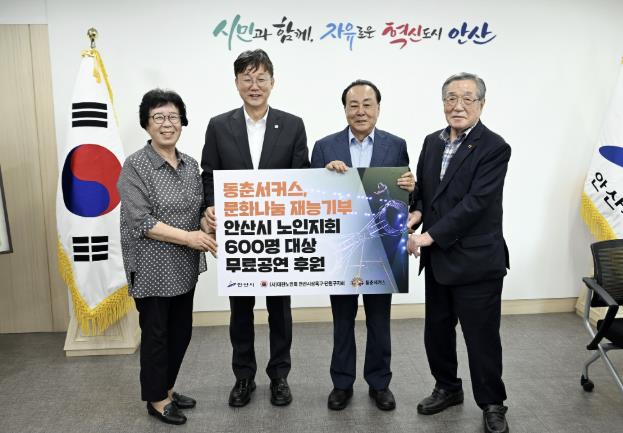 지난 12일 안산시청에서 이민근 안산시장과 박세환 동춘서커스 대표, 상록노인지회 수석부회장, 단원노인지회장 등이 참석한 가운데 동춘서커스의 재능기부 전달식이 개최됐다.