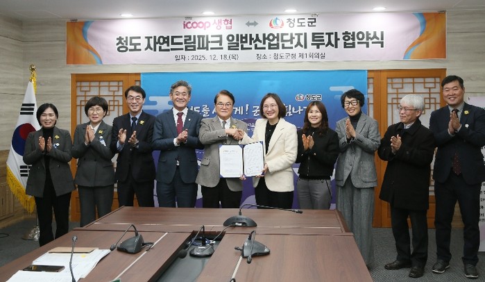 [코리아 이슈저널=김태훈 기자] 청도군은 지난 12월 18일 아이쿱소비자생활협동조합연합회와 '청도 자연드림파크 일반산업단지' 조성 및 투자 활성화를 위한 투자협약을 체결했다고 밝혔다.