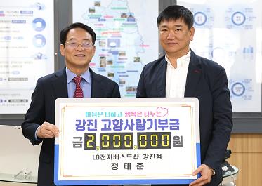 [코리아 이슈저널=김종오 기자] 윤영철 ㈜덕인약품 대표와 정태준 LG전자베스트샵 강진점 정종훈 대표의 아들이 춘사월의 따뜻한 마음을 담아 강진 고향사랑기부금 각 1백만 원, 2백만 원을 기탁했다.