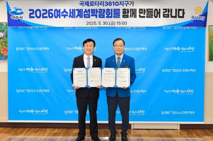 [코리아 이슈저널=김종오 기자] 여수시와 국제로타리3610지구가 2026여수세계섬박람회 성공개최를 위한 상호 협력을 다짐하며 지난 30일 업무협약을 체결했다.