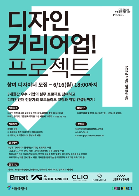 서울시는 ▴이마트 ▴YG엔터테인먼트 ▴클리오 ▴파라다이스 ▴제리백 등 5개 기업과 프로젝트를 수행할 디자인 관련학과 졸업 후 5년 이내 미취업 신진 디자이너 20명을 모집한다.