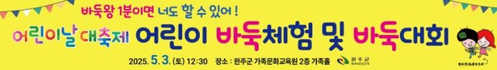 [코리아 이슈저널=김종오 기자] 완주군이 2025년 어린이날 대축제를 맞아 어린이들을 위한 다채로운 행사를 준비한 가운데, 어린이 바둑 체험 및 바둑대회를 특별 프로그램으로 운영한다.