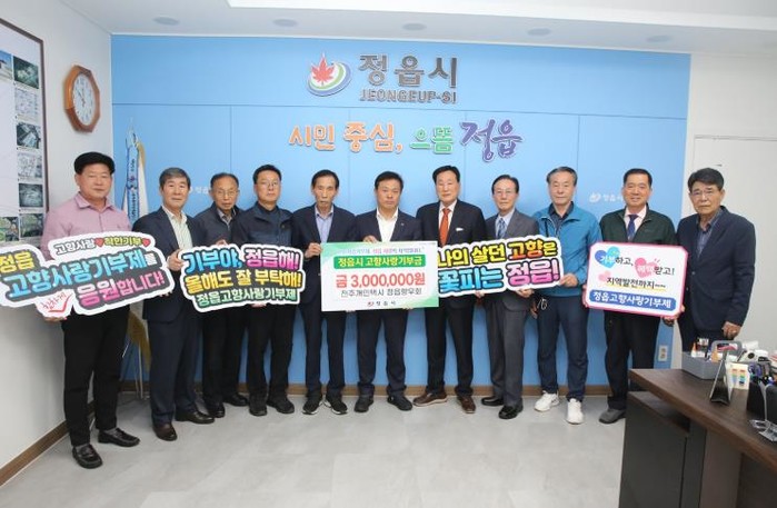지난 23일 정읍시청에서 열린 기탁식에는 김영철 회장을 비롯한 향우회원 10명이 참석해 300만원의 고향사랑기부금을 전달했다.