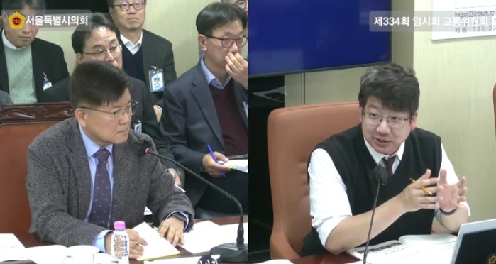 | ▲ 서울시의회 교통위원회 회의 중 한국영 서울시설공돤 이사장(좌) 문성호 의원(우) |