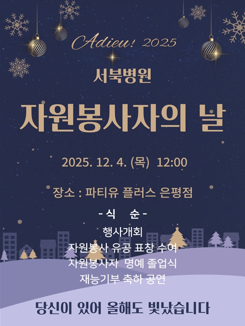 [코리아 이슈저널=최준석 기자] 서울시 서북병원은 UN 지정 국제기념일인 ‘자원봉사자의 날’을 맞아 12월 4일 파티유플러스 은평점에서 ‘2025년 서북병원 자원봉사자의 날 기념행사’를 개최한다고 밝혔다. 이번 행사는 1년 동안 의료취약계층 환자의 곁을 지키며 따뜻한 손길을 전해 온 자원봉사자들의 노고를 격려하고, 자원봉사 문화 확산과 지역사회와의 동행을 다짐하는 자리로 마련됐다.