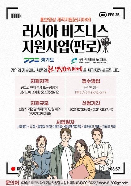 지원 대상은 본사 또는 공장등록이 경기도에 소재한 중소(중견) 기업으로, 모집을 통해 선정된 기업은 자사 기술 또는 제품에 대해 러시아어로 된 홍보 동영상 제작을 지원받을 수 있다. 지원금액은 기업 당 최대 300만 원까지다.