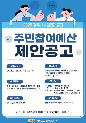 [코리아 이슈저널=김태훈 기자] 경주시시설관리공단은 경주 시민을 대상으로 2026년 예산 반영을 위한 ‘2025년 주민참여예산 제안사업 공모’를 7월 31일부터 8월 20일까지 3주간 실시한다.