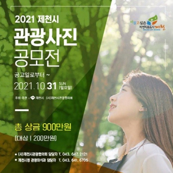 ㈔제천시관광협의회 주관으로 펼쳐지는 이번 공모전의 주제는 제천시의 우수한 관광지와 자연경관, 일상 활동, 축제 등이며 사진 및 영상으로 출품할 수 있다.