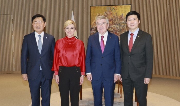▲ 김관영 전북특별도지사는 8일(현지시간) 스위스 로잔에 위치한 국제올림픽위원회(IOC) 본부를 방문해 토마스 바흐 IOC 위원장을 비롯하여 콜린다 그라바르키다로비치 IOC 미래유치위원장 등과 만나 전북 전주 하계올림픽 유치 비전을 피력하고 있다.-왼쪽부터 김관영 전북특별자치도지사, 콜린다 그라바르키다로비치 IOC 미래유치위원장, 토마스 바흐 IOC위원장, 유승민 대한체육회장 |