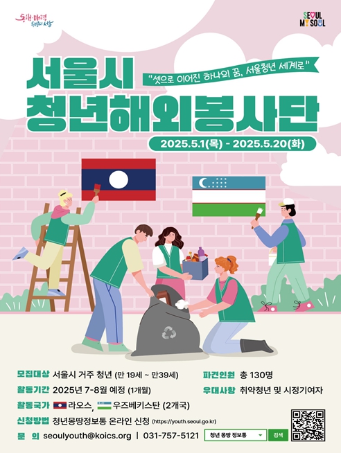 [코리아 이슈저널=최준석 기자] 서울시 청년 해외봉사단이 올해는 우즈베키스탄과 라오스로 떠난다. 서울시는 청년들의 국제 개발 협력 참여 기회를 확대하고, 봉사활동을 통한 글로벌 시민 의식 함양을 지원하는 청년 해외봉사단 3기를 5월 1일부터 모집한다고 밝혔다.