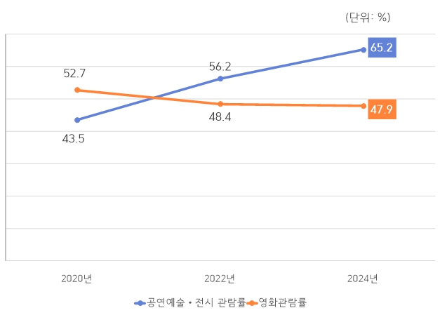 처음으로 공연예술·전시관람(56.2%)이 영화 관람(48.4%)을 뛰어넘었던 지난 조사에 이어 이번에도 공연예술·전시 관람 65.2%, 영화 관람 47.9%로 격차가 더 벌어졌다. OTT 서비스 확대로 영화관 관람은 줄어든 반면 오프라인 기반 공연‧전시의 경우 대체불가한 특성과 팬데믹 이후 시민들의 문화적 욕구 증대, 콘텐츠 다양화 등 순수 예술 수요 증가가 영향을 미친 것으로 해석된다.
