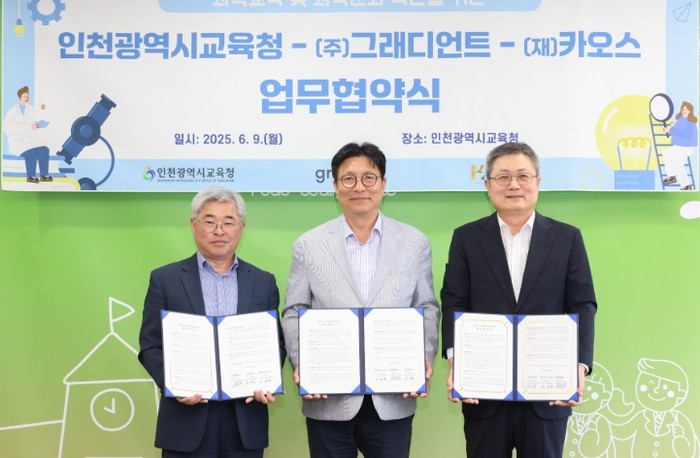 [코리아 이슈저널=홍춘표 기자] 인천광역시교육청은 ㈜그래디언트(대표 남인봉), 재단법인 카오스와 과학교육 및 과학 문화 확산을 위한 업무협약을 체결하고, 미래 과학 인재 양성을 위한 협력체계를 본격 구축한다고 10일 밝혔다.