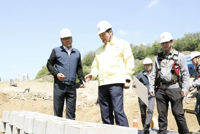 ▲ 최대호 안양시장이 지난 5월 7일 오전 동안구 비산동 일원 비산포일통합정수장 현대화사업 현장을 방문해 진행상황에 대한 브리핑을 받고있다