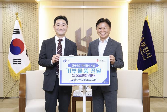 [코리아 이슈저널=홍춘표 기자] 부천시는 지난 9일 사회적기업 ㈜위드플러스시스템이 부천시청 만남실에서 치매환자 지원물품 2,000만 원 상당을 기부했다고 11일 밝혔다. 이번 기부는 지역사회 돌봄 강화를 위한 위드플러스시스템의 지속적인 사회공헌 활동의 일환이다.