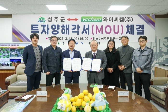 [코리아 이슈저널=김태훈 기자] 성주군은 3월 11일 군수실에서 와이씨켐㈜과 투자양해각서(MOU)를 체결하고, 투자사업의 원활한 추진을 위한 상호 협력에 나섰다.