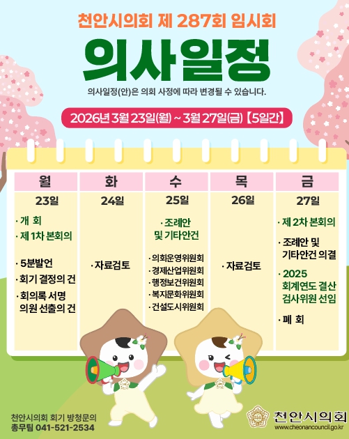 [코리아 이슈저널=홍춘표 기자] 천안시의회가 오는 3월 23일부터 27일까지 5일간의 일정으로 제287회 임시회를 운영한다.