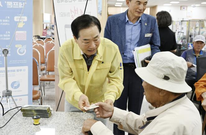 ▲ 지난 7월 21일, 성낙인 창녕군수가 창녕읍행정복지센터에서 어르신의 소비쿠폰 신청을 도와드리고 있다.