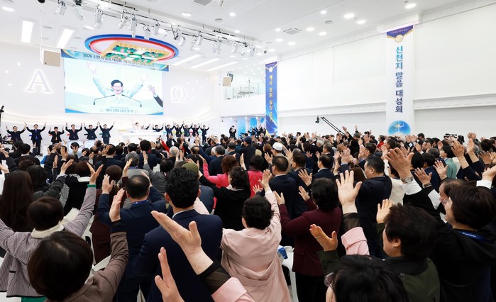 ▲지난 28일 신천지 영등포교회에서 ‘2026 신천지 말씀 대성회 계시 성취 실상 증거’가 열린 가운데, 참석자들이 이만희 총회장의 강연을 듣고, 영광올리고 있다.