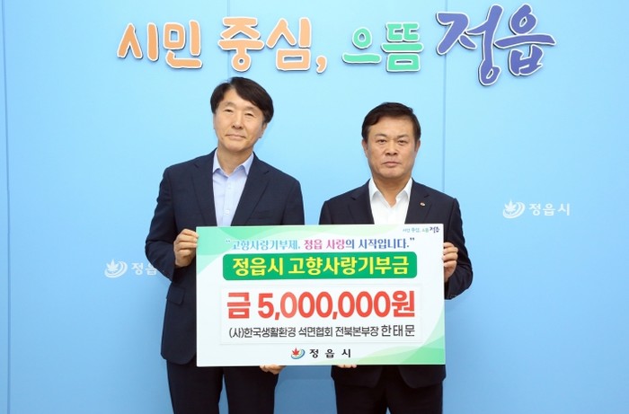 [코리아 이슈저널=김종오 기자] (사)한국생활환경석면협회 전북본부 한태문 본부장이 고향 정읍을 찾아 500만원의 고향사랑기부금을 전달했다.