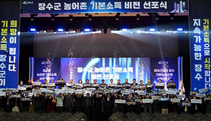 [코리아 이슈저널=김종오 기자] 장수군은 8일 한누리전당 산디관에서 ‘농어촌 기본소득 비전 선포식’ 행사가 성황리에 개최됐다고 밝혔다.