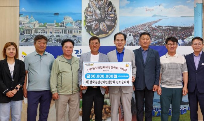 [코리아 이슈저널=김종오 기자] (재)진도군인재육성장학회는 13일, 사)한국김생산어민연합회 진도군지회로부터 총 3,000만 원의 장학금을 기탁받았다고 밝혔다.