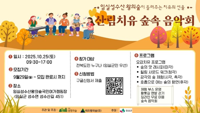 [코리아 이슈저널=김종오 기자] 임실군이 오는 25일 성수산 왕의숲 국민여가캠핑장 일원에서‘성수산 왕의숲 산림치유 숲속 음악회’를 개최한다.