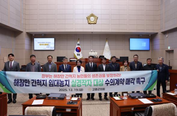 [코리아 이슈저널=홍춘표 기자] 고흥군의회는 12월 19일 열린 제342회 고흥군의회 제2차 정례회 제11차 본회의에서 '해창만 간척지 임대농지 실경작자 대상 수의계약 매각 촉구 건의안'을 의결하고, 해창만 간척지 임대농지를 실경작자에게 수의계약 방식으로 매각할 것을 정부와 관계 부처에 강력히 촉구했다.