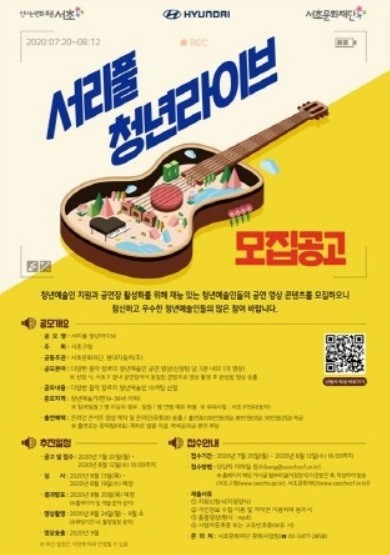 [열린의정뉴스 = 최성일 기자] 서울 서초구(구청장 조은희)는 서초문화재단, ㈜현대자동차 남부지역본부와 함께 실력 있는 청년예술인들을 발굴하고 침체한 공연장을 활성화하기 위한 언택트 온라인 문화공연 '서리풀 청년라이브'에 참여할 청년예술인들에 대한 공모를 추진한다고 밝혔다.