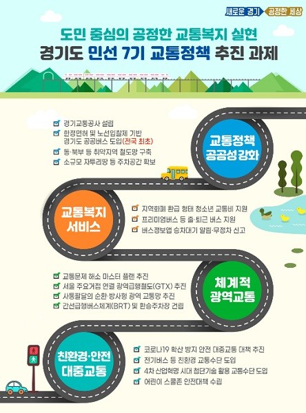 이에 경기도는 지난 2018년부터 ‘도민 중심의 공정한 교통복지 실현’을 민선7기 교통정책 비전으로 확립하고, ①공공성 강화, ②교통복지 서비스 제공, ③선제·체계적 광역교통대책 수립, ④친환경·안전한 대중교통 이용환경 조성 등 4개 분야 중점방향을 설정해 다양한 정책과 사업들을 추진 중이다.