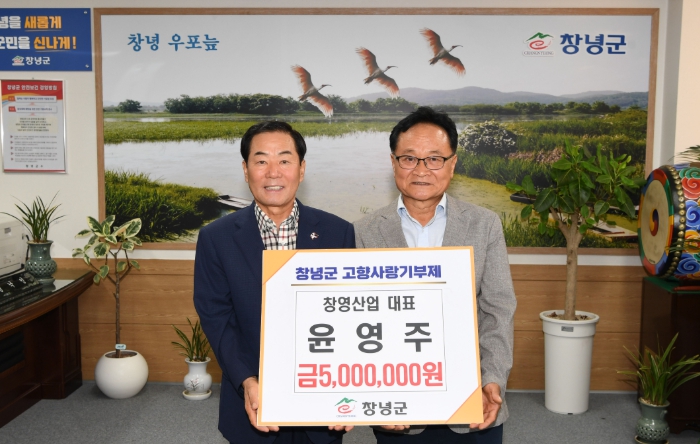 [코리아 이슈저널=김태훈 기자] 창녕군은 지난 30일 윤영주 창영산업 대표가 고향사랑기부제에 동참해 기부금 500만 원을 기탁했다고 밝혔다.