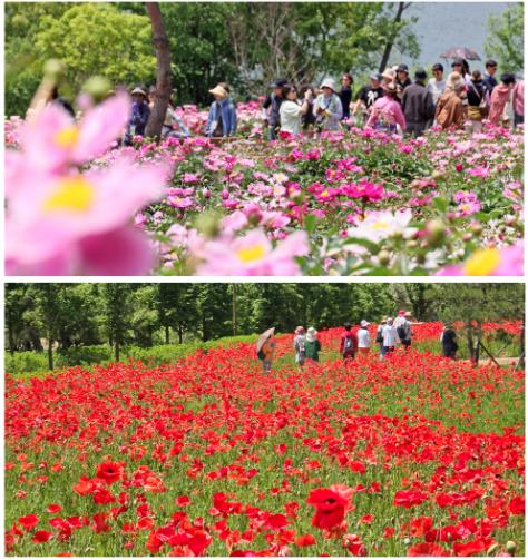 ▲ 임실군 옥정호 붕어섬 생태공원, 작약‧꽃양귀비 만개에 관광객 북적 |