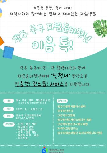 [코리아 이슈저널=김종오 기자] 광주 동구는 자립준비청년의 안정적이고 건강한 자립을 지원하기 위해 민관 기관들과 협력해 맞춤형 서비스 연계망 사업인 ‘광주 동구 자립준비 청년 이음 톡’을 구축했다고 밝혔다.
